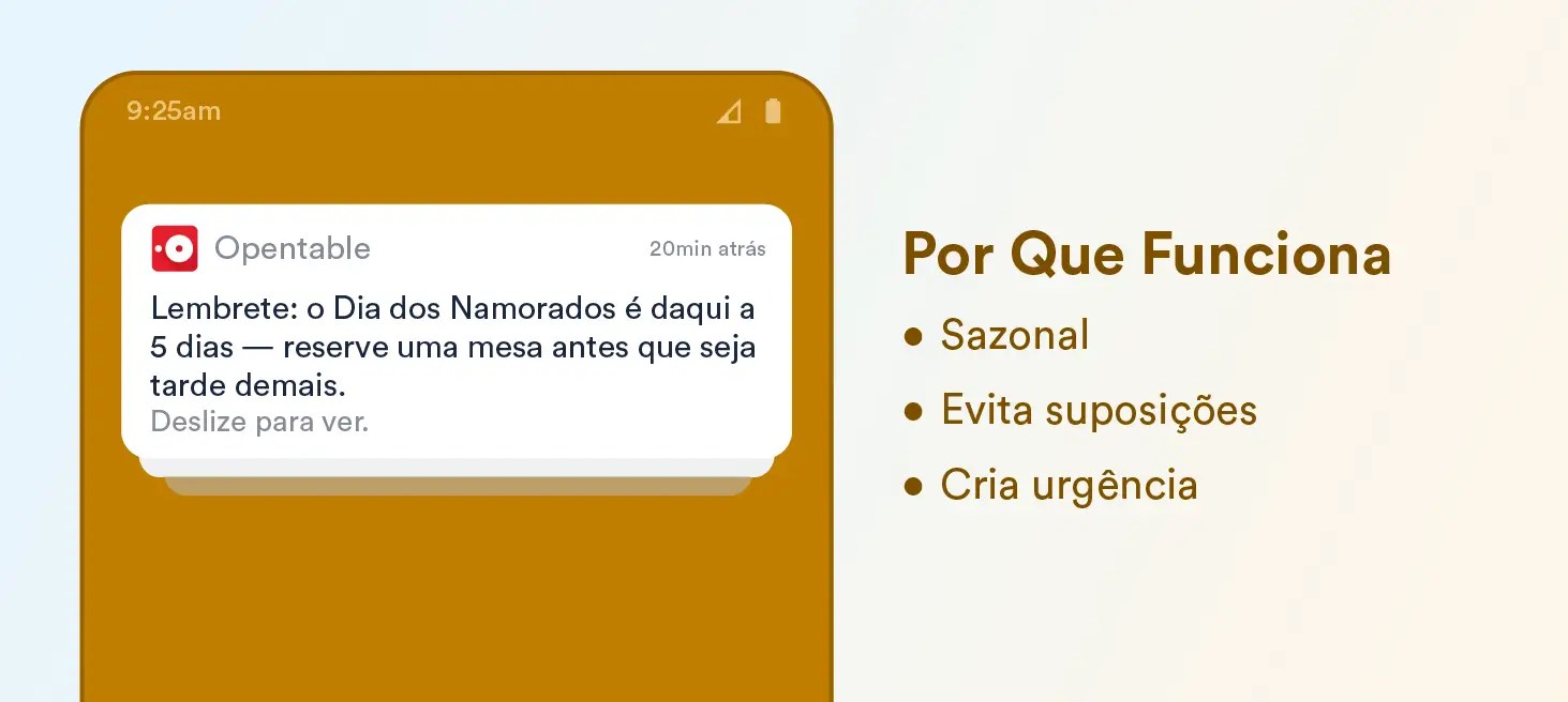 Acionável: “Reserve uma mesa antes que seja tarde demais” evoca a imagem de restaurantes completamente lotados. Se uma oferta tem limite de tempo ou está vinculada a um evento de calendário, informar o prazo exato é uma prática recomendada para notificações.