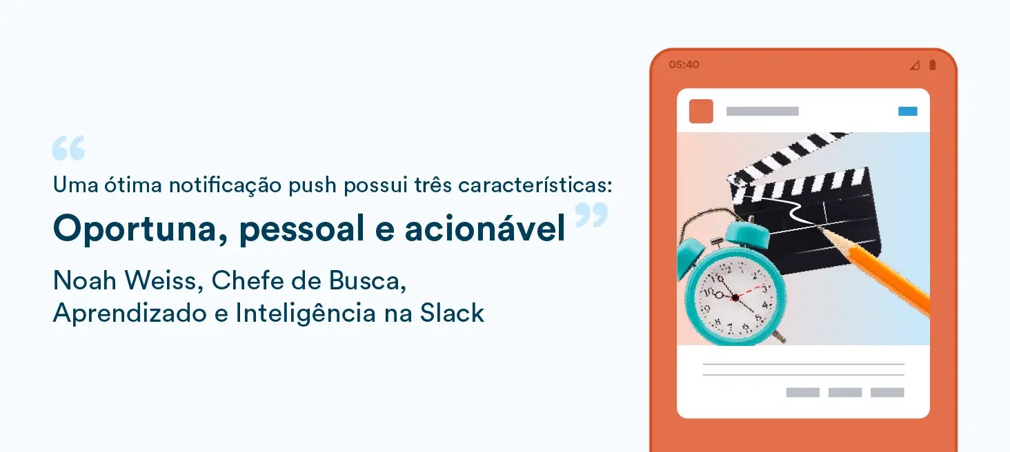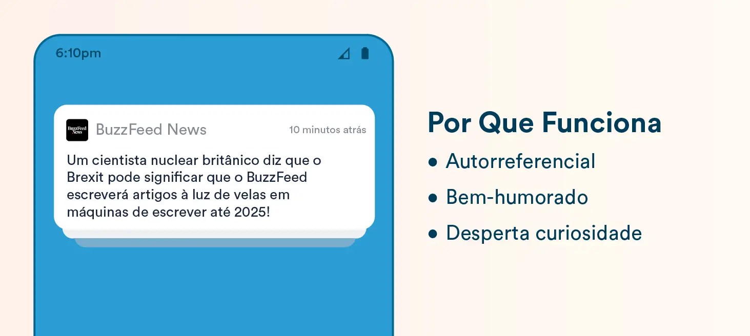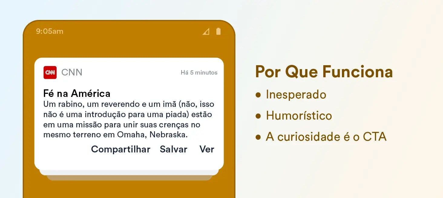 - Clickbait sem substância: Sim, você sempre quer despertar a curiosidade do usuário. Mas, se prometer que o usuário vai viver uma experiência válida ao clicar na notificação, entregue o que prometeu. Sua notificação push nunca deve escrever um cheque que seu conteúdo não pode cobrir.