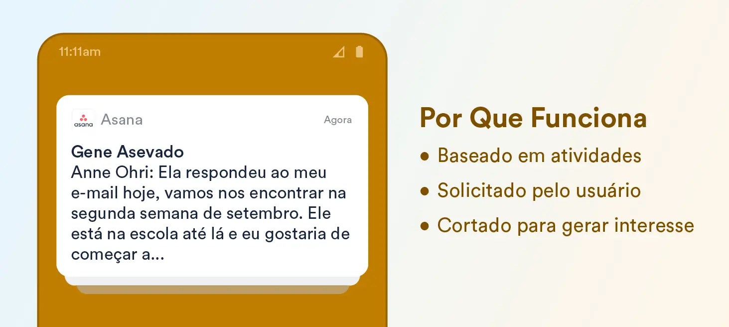 Ao fornecer uma prévia truncada do conteúdo da mensagem, o Asana engaja o usuário e o incentiva a responder. Embora alguns usuários possam desabilitar notificações como essas em nome do equilíbrio entre vida pessoal e profissional, os usuários que as ativarem apreciarão a imediatidade.