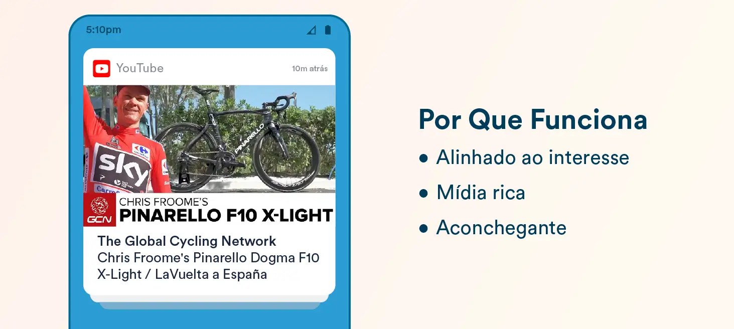 O usuário se inscreveu em canais de ciclismo no YouTube. Isso significa que provavelmente estará interessado em conteúdo novo sobre corridas, equipamentos e ciclistas.