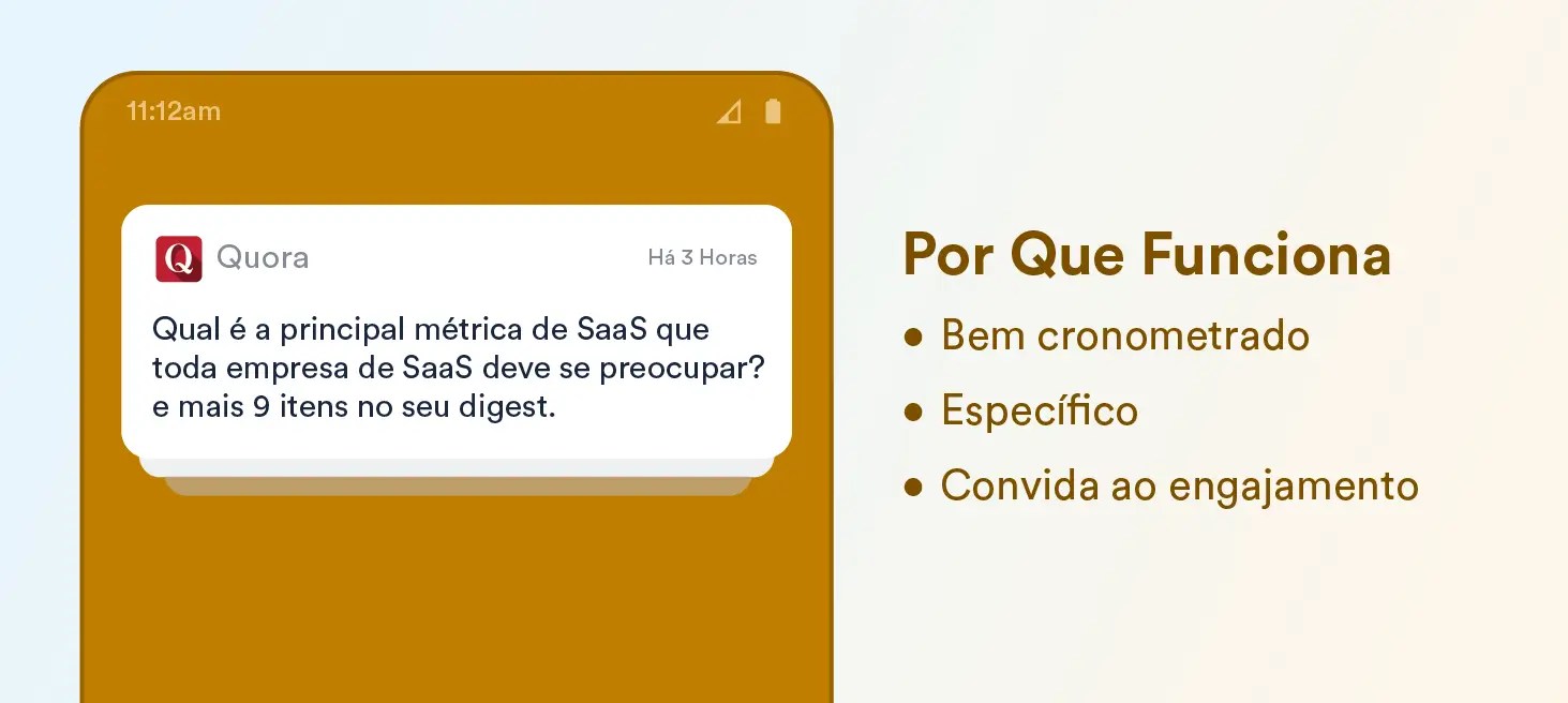 Esta notificação chegou justo antes de os usuários com horários de trabalho das 9h às 17h precisarem se concentrar no trabalho. O Quora parece estar apostando que as pessoas passarão alguns minutos lendo tópicos relacionados a carreiras antes de começar a trabalhar de fato.