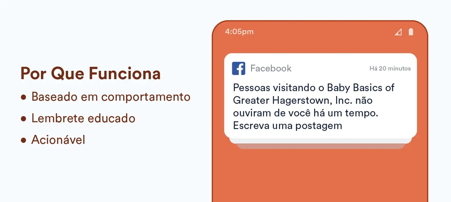 Pessoal: Esta notificação push pode ser uma pequena tentativa de fazer alguém que administra uma página no Facebook se sentir culpado por não abrir o aplicativo. Mas é suavizada pela expressão casual “não ouvimos de você há um tempo”. Ela também incentiva os administradores a manterem conexões pessoais com os seguidores.
