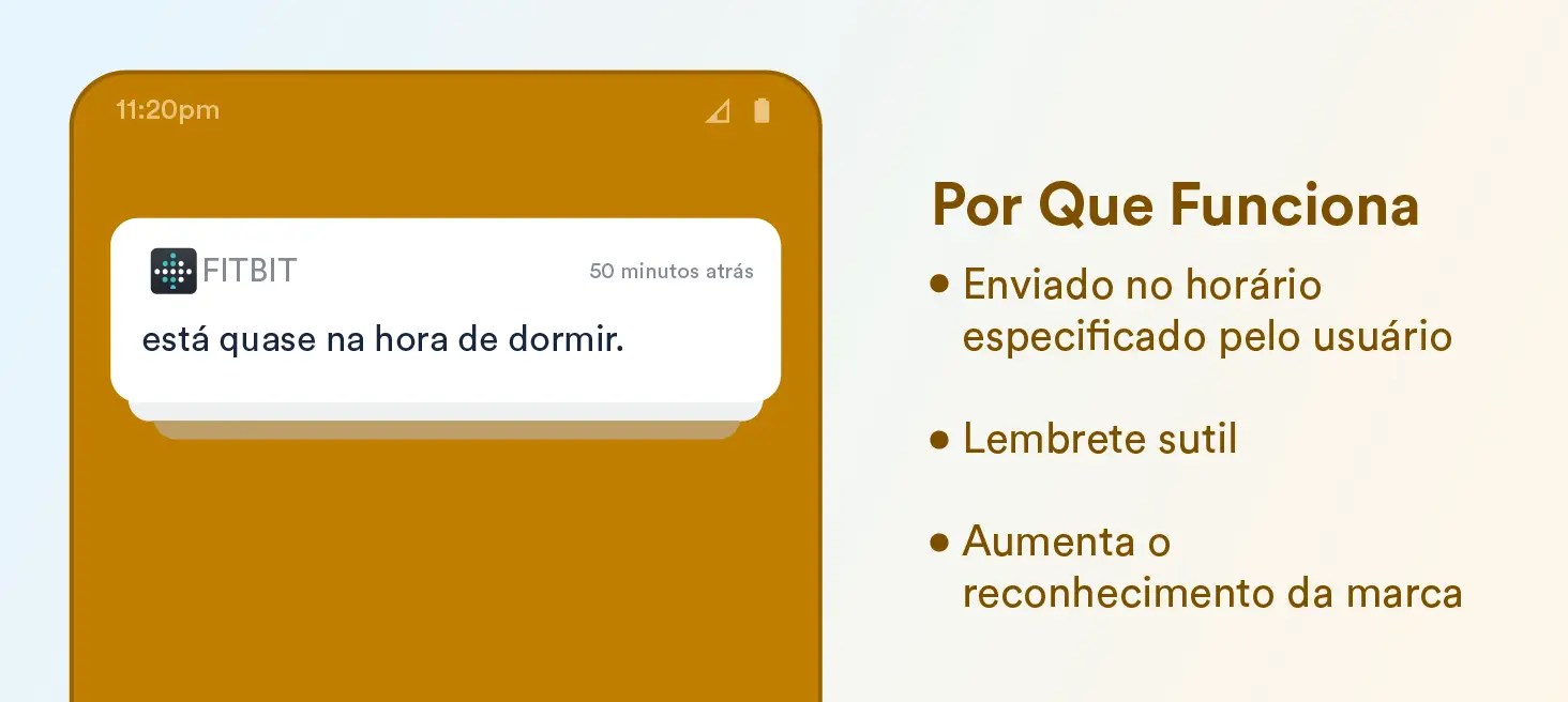 Oportuno: Os usuários especificam seus horários ideais de dormir no Fitbit. Então, o Fitbit envia um lembrete para ajudá-los a manter o ritmo.