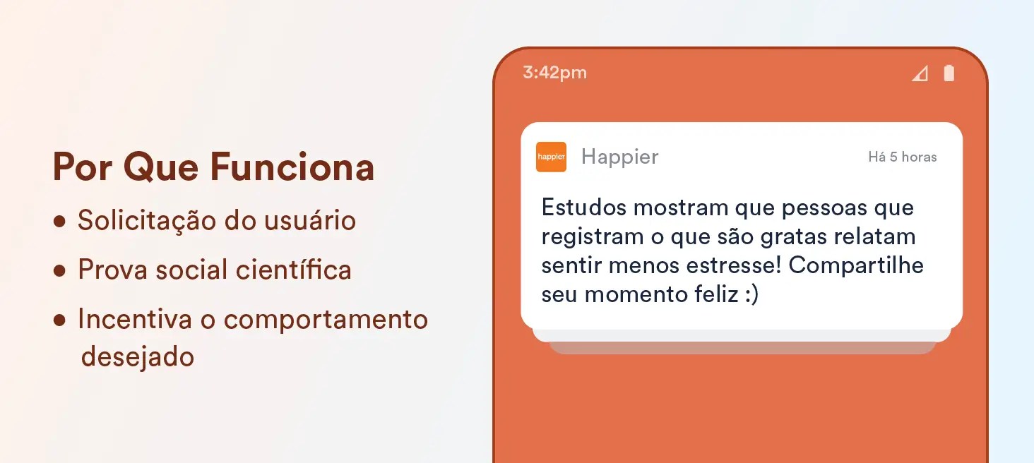 Oportuno: O usuário expressou interesse em registrar sua gratidão, e essa notificação serve para lembrá-lo de fazer isso. É algo do tipo “você pediu!”