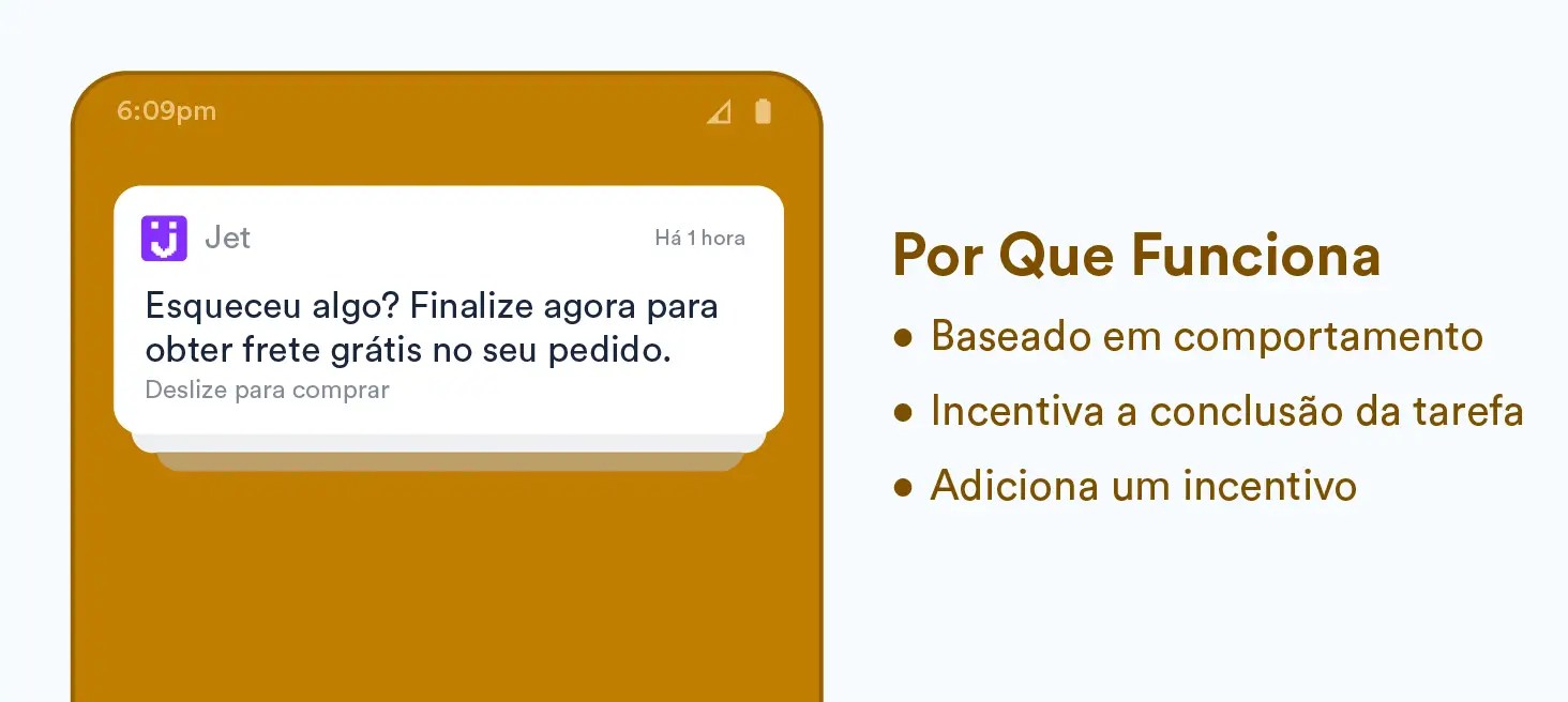 Oportuno: Esta é uma notificação push baseada em comportamento, enviada após o usuário não tomar nenhuma ação por um período de tempo especificado.