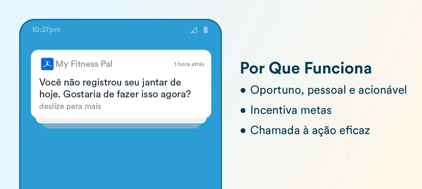 Oportuno: Esta mensagem é enviada após o jantar, caso o usuário não tenha interagido com o aplicativo para registrar o que comeu. A palavra em maiúsculas seletivas — “Jantar” — se destaca no texto enquanto o usuário faz a leitura. (Maiúsculas seletivas é uma boa prática de notificação push que vamos abordar em breve.)