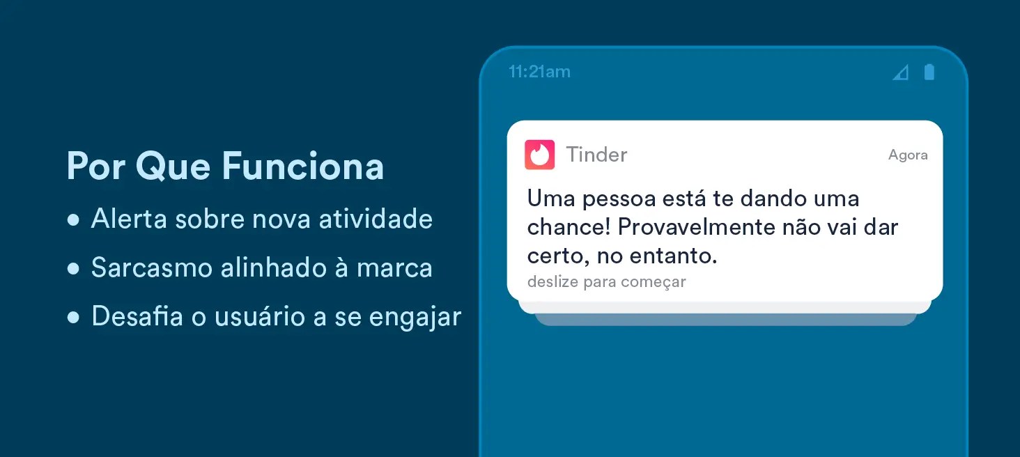 Oportuno: Esta mensagem é enviada aos usuários do aplicativo de namoro Tinder quando alguém desliza para a direita para demonstrar interesse.