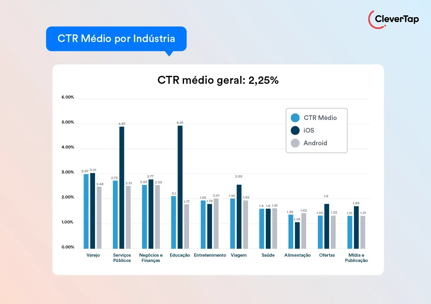 - Taxa de Cliques (CTR): Mede quantos usuários clicaram em links ou botões de ação dentro da notificação. A Taxa de Cliques (CTR) é um bom indicador de engajamento.
