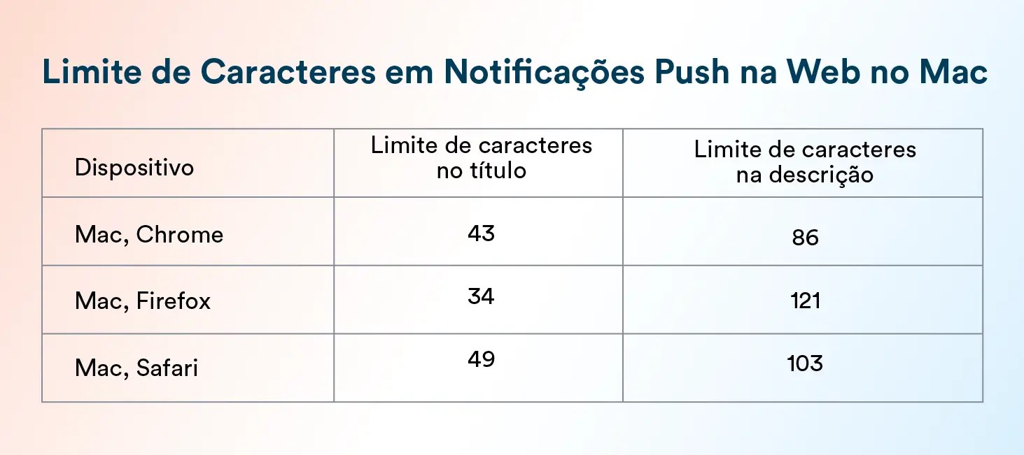 MacBooks suportam diferentes limites de caracteres para diferentes navegadores. Aqui está a lista de limites de caracteres para notificações push no Mac: