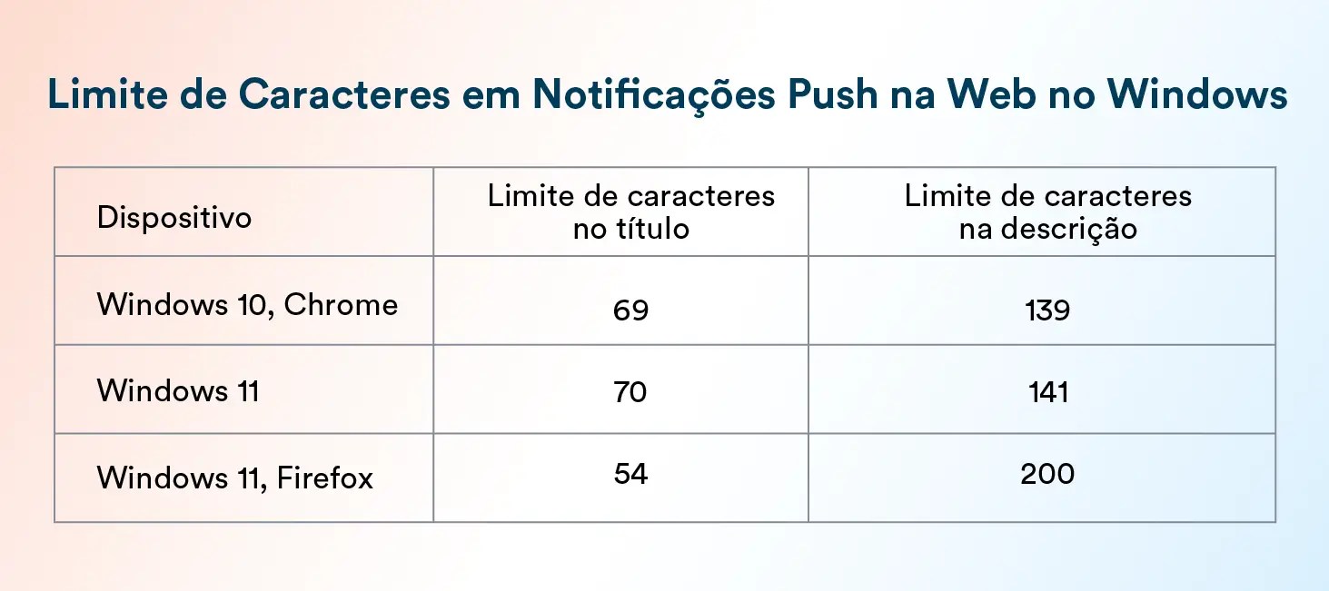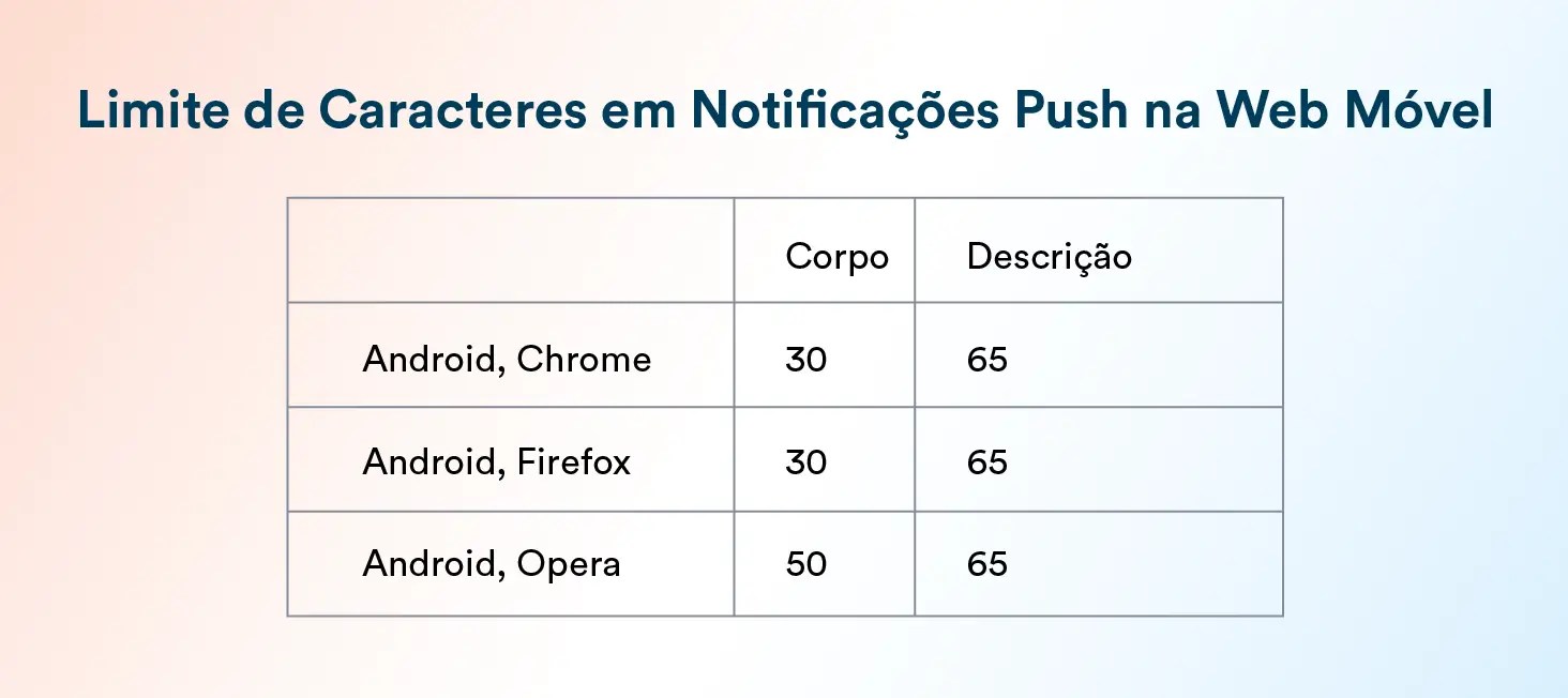 Diferentes plataformas têm limites de caracteres variados para notificações push. Vamos detalhar os limites.